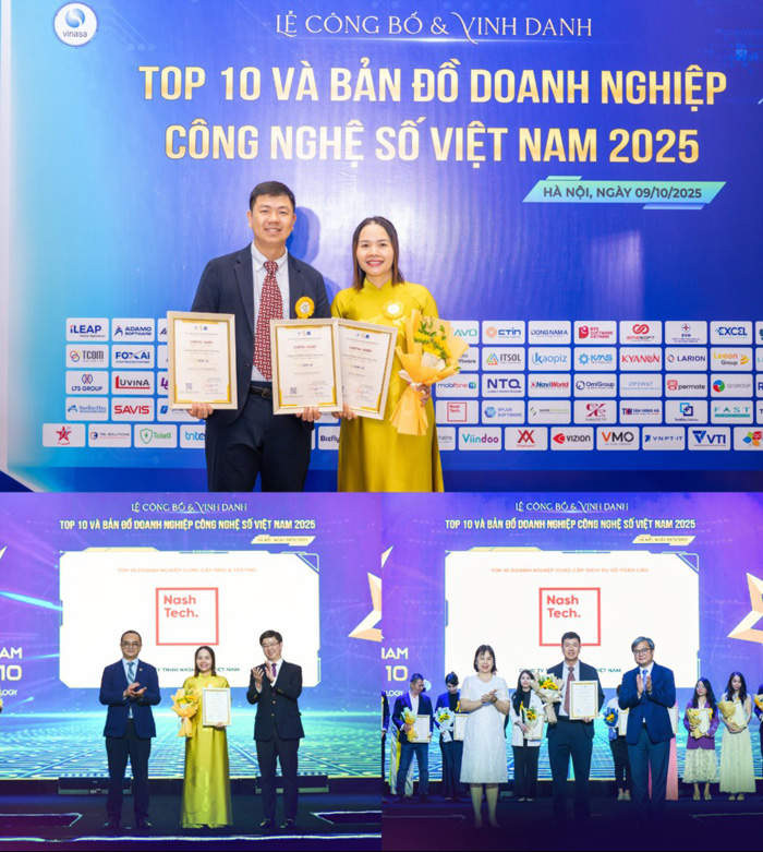 Ngày 9/10/2025, tại Lễ Vinh danh Top 10 và Công bố Bản đồ Doanh nghiệp Công nghệ số Việt Nam 2025 do Hiệp hội Phần mềm và Dịch vụ CNTT Việt Nam (VINASA) tổ chức, NashTech tiếp tục được vinh danh trong Top 10 Doanh nghiệp Công nghệ số Việt Nam, đánh dấu 12 năm liên tiếp hiện diện trong bảng xếp hạng danh giá này.